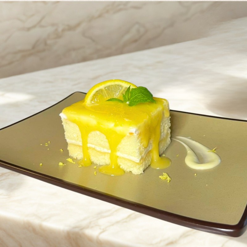 (297 سعرة حرارية)قطعة من الكيك بنكهة الليمون الحقيقة وتقدم مع صوص مميز خاصة بها