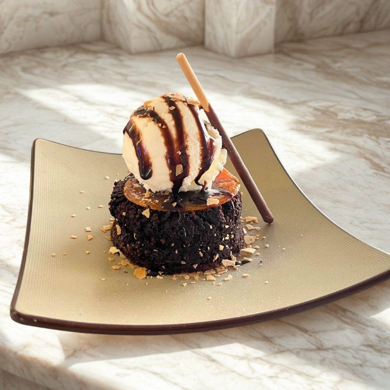 (934 سعرة حرارية)براوني بالشكولاتة والآيس كريم ويقدم مع صوص من الشكولاتة البلجيكية