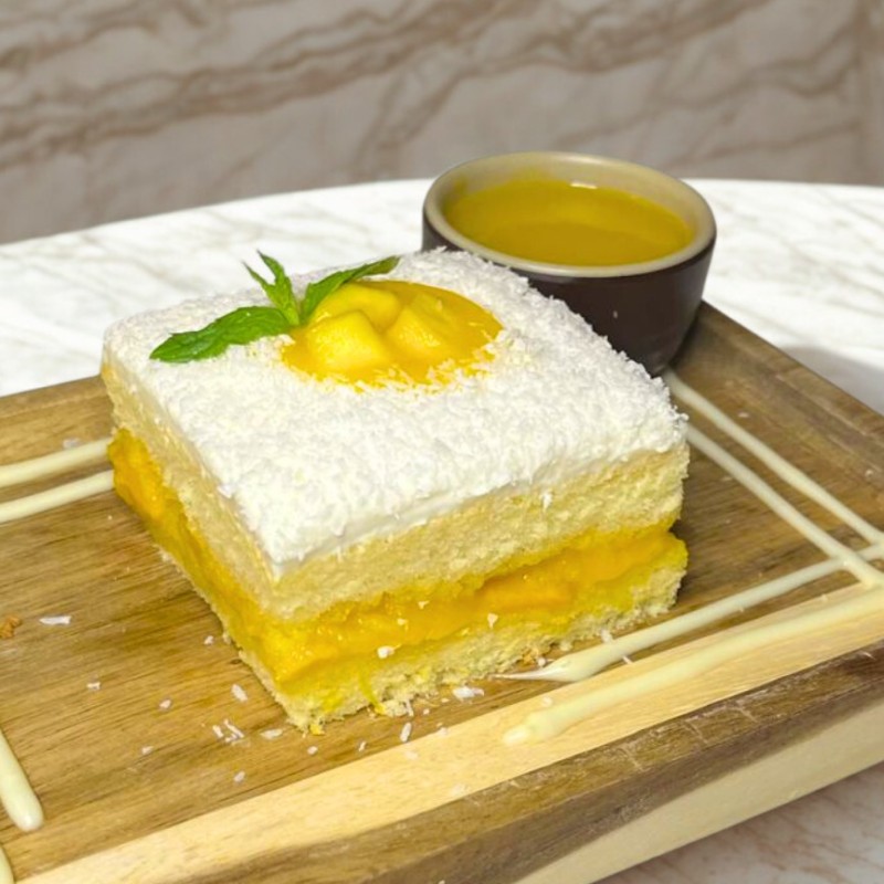 (365 سعرة حرارية)كيكة المانجو مع جوز الهند كيكة إسفنجية ناعمة ممزوجة بقطع المانجو الطازجة، مغطاة بطبقة كريمية خفيفة ونكهات جوز الهند المحمص، لتمنحك توازنًا مثاليًا بين الحلاوة والانتعاش الاستوائي