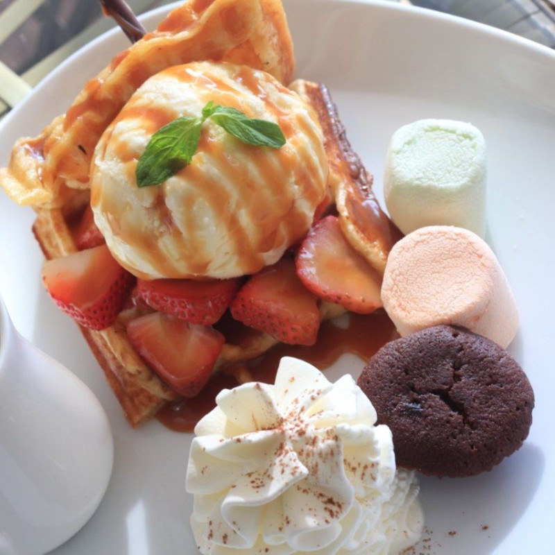 (590 سعرة حرارية)خلطه طازجة من الوافل ، محشوة بصوص مع قطع فواكه طازجة من إختياركم