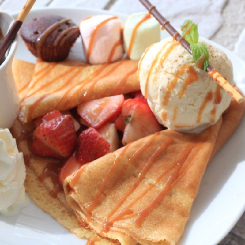 (662 سعرة حرارية)دولتشي فينيزيا بالطريقة الأصلية مع قطع الفراولة الطازجة و صوص الشكولاتة البلجيكية او صوص آخر من اختيارك وتقدم مع الآيسكريم